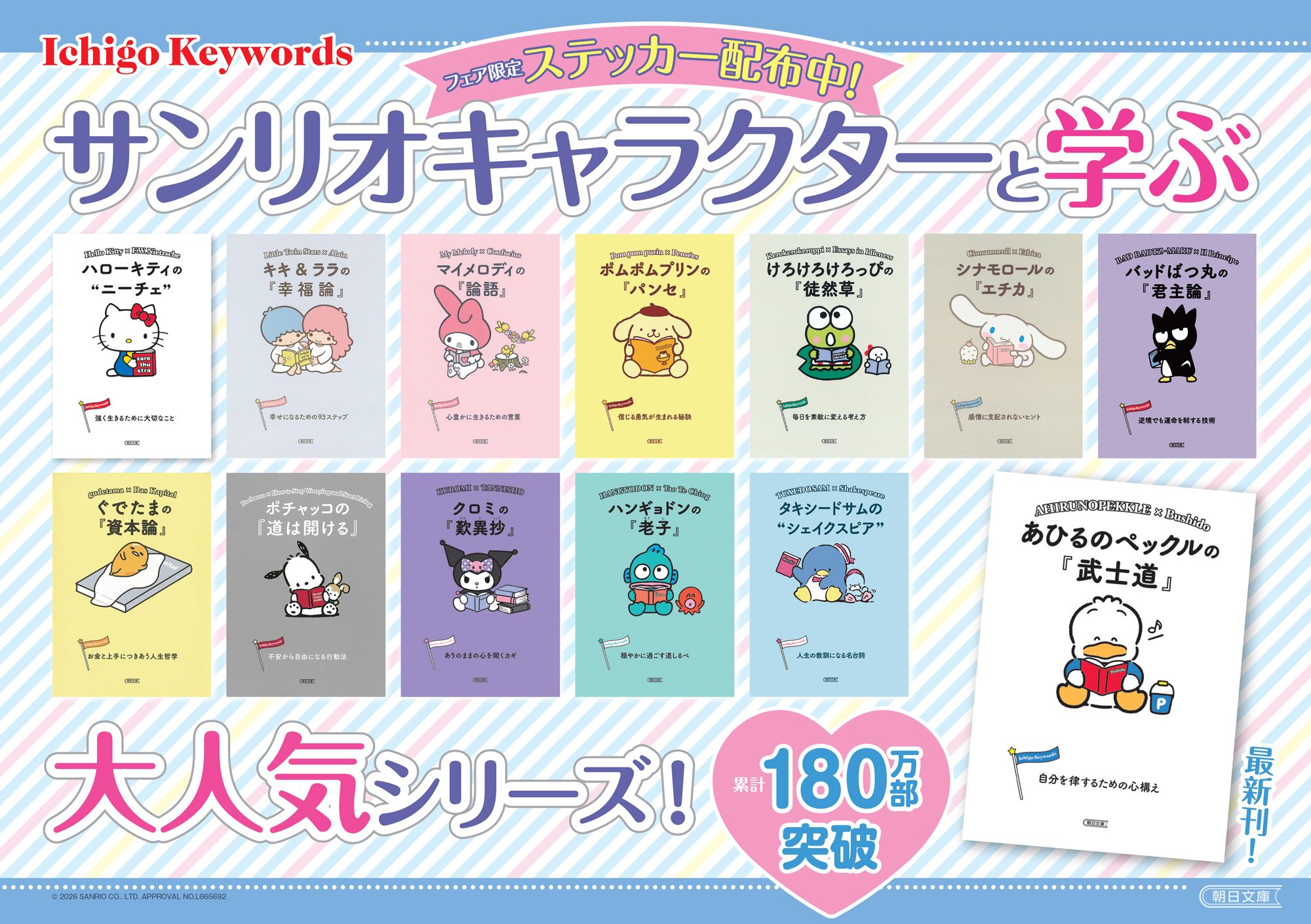 サンリオキャラクターと名著のエッセンスを学ぶ「Ichigo Keywords」シリーズの最新刊「あひるのペックルの『武士道』 自分を律するための心構え」が4月24日に発売となります。 それにあわせ、期間限定書店フェアが全国47都道府県・1500店舗以上で実施されます。 フェア特典として、「Ichigo Keywords」シリーズを1冊でも購入いただいた方は、必ずオリジナルステッカーシールがもらえます!