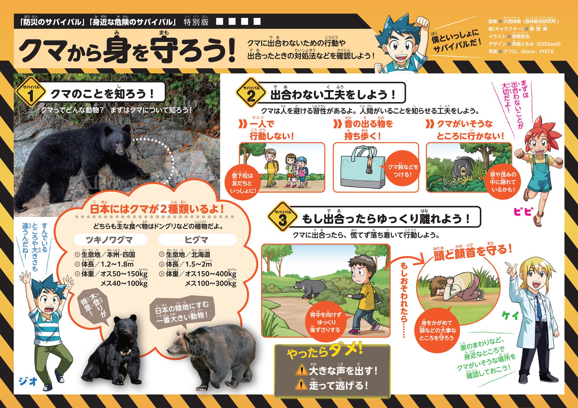 あやしい人がついてきたらどうする? 留守番中にインターホンが鳴ったら出てもいい? SNSで投稿してはいけない情報ってなに? 学校でおなかが痛くなったらどうする? ……。犯罪から身近にひそむピンチまで、身の回りの様々な危険への対処法をクイズ形式で出題。学校生活を安全に過ごすための方法や友達との付き合い方、交通ルールや電車でのマナー、ネットリテラシーなどを楽しく学べます。